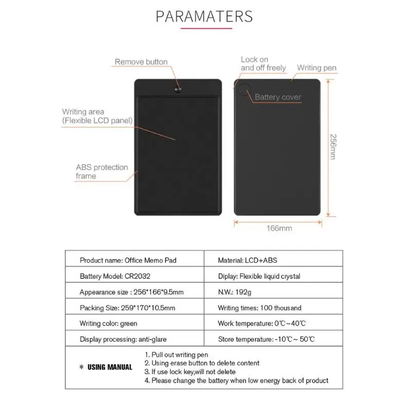 | Howeasy Board Portable 10 Inch LCD Electronic Writing Tablet Digital Drawing Handwriting Pad Kids Gift Features: Writing area pressure sensing principle, which allows you to draw or write with a pen or a finger. Erase button: press the button to clear the written content. Specifications: Material: LCD screen, ABS frame Battery model: CR2032 Product size: 256 x 166 x 9.5mm/10.08 x 6.54 x 0.37" Packing size: 259 x 170 x 10.5mm/10.19 x 6.69 x 0.41" Product weight: 192g Font color: blue green (bold) Product color: black/ white Certification: CE, EMC, FCC, RoHS Notes: 1. There may be slight size deviations due to manual measurement, different measuring methods and tools. 2. The picture may not reflect the actual color of the item because of different photographing light, angle and display monitor. 1 x LCD Writing Tablet 1 x Stylus Pen 1 x Package Box ![]() ![]() ![]() ![]() ![]() ![]() ![]() ![]() ![]() ![]() ![]() ![]() ![]() ![]() |